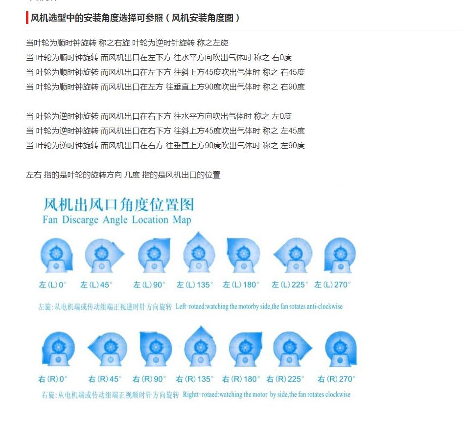 葉輪的旋向是采購(gòu)風(fēng)機(jī)葉輪時(shí)主要技術(shù)要求,從風(fēng)機(jī)進(jìn)風(fēng)口判斷,葉輪旋轉(zhuǎn)方向?yàn)轫槙r(shí)針?lè)较驗(yàn)樽笮?,逆時(shí)針旋轉(zhuǎn)為右旋;從電機(jī)(皮帶輪)側(cè)正視風(fēng)機(jī),葉輪按順時(shí)針?lè)较蛐D(zhuǎn)為右旋,逆時(shí)針旋轉(zhuǎn)為左旋。左右指的是葉輪的旋轉(zhuǎn)方向,角度指的是風(fēng)機(jī)出口的位置。